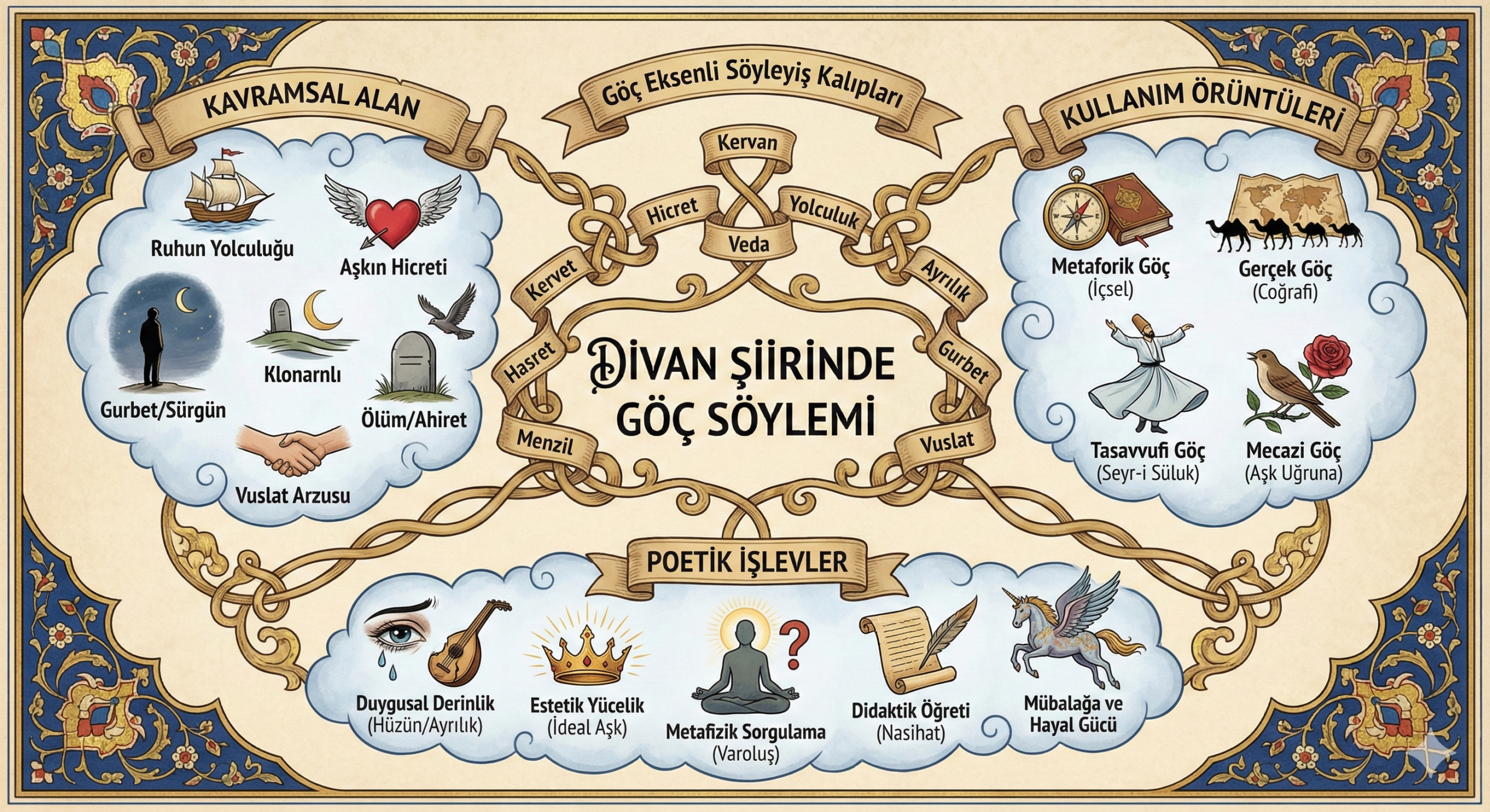 • Somut göç: Şehirler, bölgeler ve ülkeler arası hareket, “terk-i diyar”, “sefer” ve “gurbet” kalıplarıyla sözel olarak görünür kılınır.