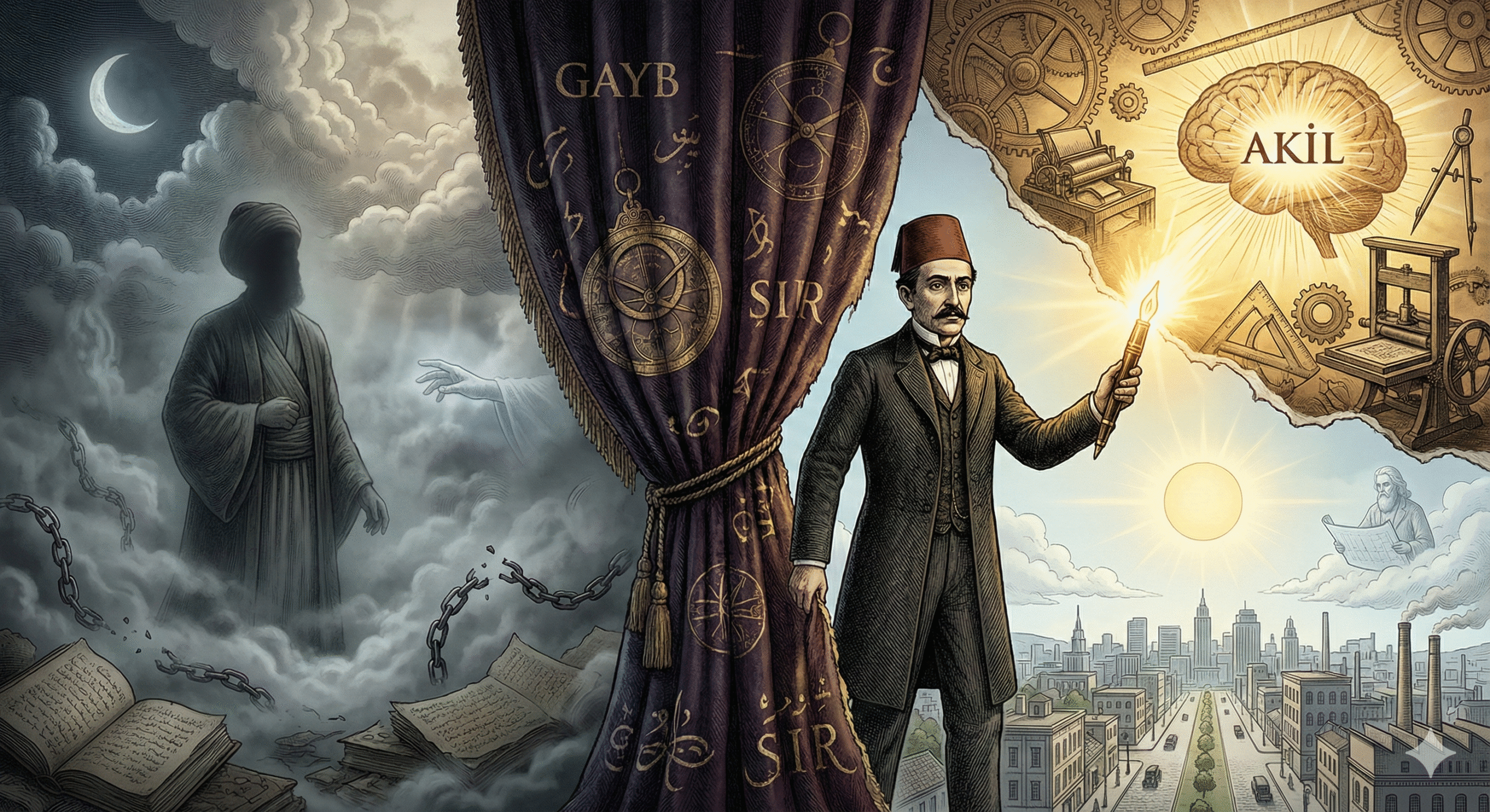 • Mutezile etkisi: Şinasi, İslam içi akılcı ekollerden ilham aldı. Mutezile’nin akıl ve mantığı merkeze alan yaklaşımı, onun metafizik karşısındaki tavrına uygun bir zemin sundu.